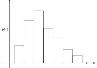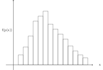 We would like to have the areas of the rectangles represent probabilities, that is, instead of \[ \begin{align} \sum p_i &= 1 \end{align} \ \] we would like \[ \begin{align} \sum f(p_i)\Delta x &= 1 \end{align} \ \] where f(pi) is some function of the probabilites and \( \Delta x \) is the width of the class rectangles.
