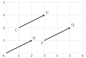 In the diagram above, if P(p1, p2) and Q(q1, q2) are two points, the vector \( \overrightarrow{PQ} \) can be represented as \[ \begin{align} \overrightarrow{PQ} &= \langle \text{x units used}, \text{ y units used} \rangle \\ &= \langle q1 - p1, q2 - p2 \rangle \\ &= \langle 5 - 3, 2 - 1 \rangle \\ &= \langle 2, 1 \rangle \end{align} \ \] The two numbers, x units and y units are called the components of the the vector.