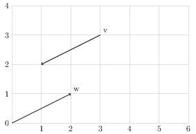 For example, in the diagram below the vectors v and w have the same length \( \sqrt{5} \). Now v is parallel to w but points in the opposite direction. So v = -w.