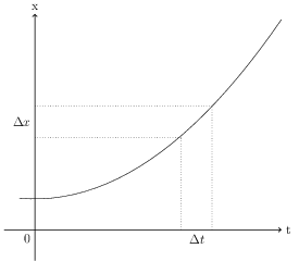 The diagram above is a plot of distance as a function of time. As \( \Delta x \) and \( \Delta t \) become smaller, the ratio \[ \frac{\Delta x}{\Delta t} \quad \ \] more and more closely approximates the gradient of the curve at the point t0. So the gradient of the curve gives the value of the instantaneous speed.