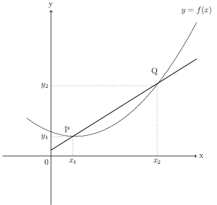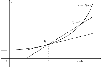 The gradient of the secant PQ in the diagram is just the differences in the y-coordinates divided by the differences in the x-coordinates. \[ \text{gradient of PQ} = \frac{\Delta y}{\Delta x} = \frac{y_2-y_1}{x_2-x_1} \quad \ \]