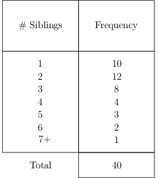 For the sibling sample, the mean is \[ \begin{align} \bar x &= \frac{108}{40} = 2.7 \end{align}\ \]