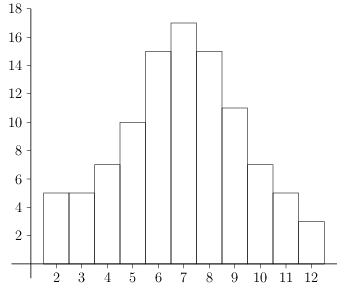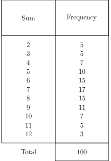 Here is a frequency table generated using two random number generators generating a random integer between 1 and 6, and recording their sum, repeated 100 times.